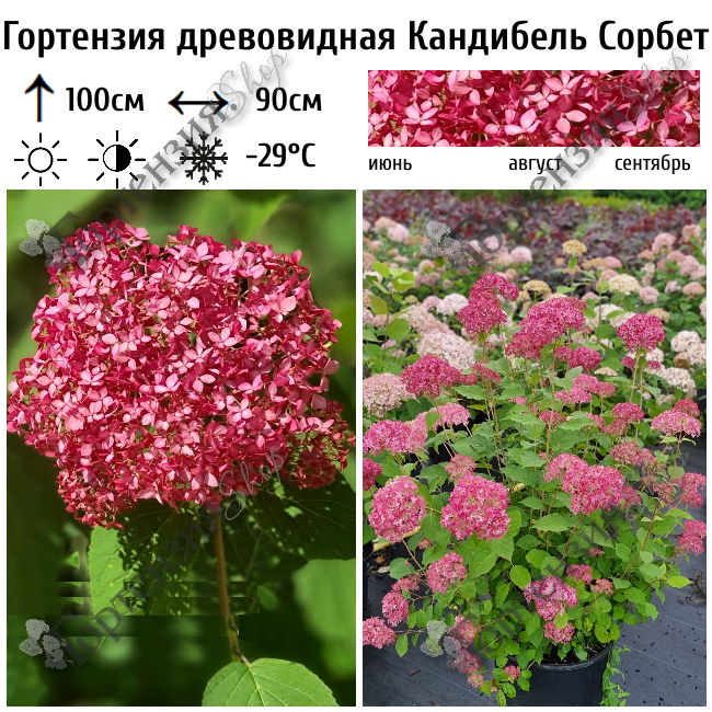 Гортензия древовидная 'Кандибель Сорбет' - отличается крепкими стеблями. Высота куста  до 100 см, ширина 90 см. Листья округлые темно-зеленые, зацветает рано в июне, темно-розовыми  соцветиями. Соцветия шаровидные, крупные, плотные, 25-30 см в диаметре. Почва должна быть кислая, влажная,  но без застоя воды. Зимостойкость-29С. В более холодных регионах цветочные почки  могут замерзнуть без защиты.