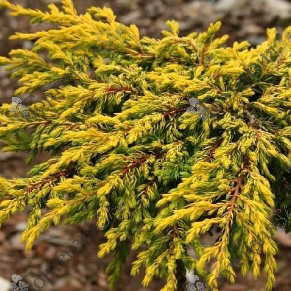 Можжевельник обыкновенный Голдшатц - почвопокровный,медленнорастущий карликовый сорт с широкой раскадистой кроной. Высота взрослого растения  до 40 см и диаметром до 2,0 м.Многолетник растет медленно, прибавляя в росте не более 6--8 см в год, достигая указанных габаритов только к 10 годам. Весной хвоя оранжево-жёлтая, летом ярко-золотистая,в тени может зеленеть.Место солнечное.