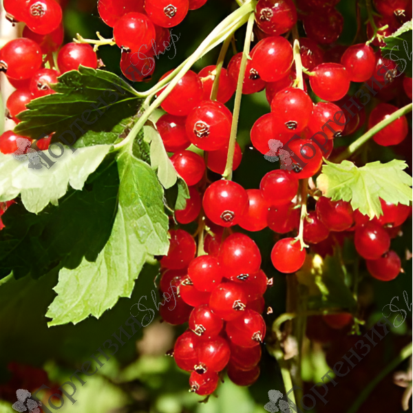 Смородина красная Сахарная - рослый кустарник с прямостоячими стеблями. Гибридное происхождение культуры обеспечивает такие великолепные качества, как высокий уровень зимостойкости, позволяющий выращивать ее в любом регионе страны, раннее плодоношение и хорошая урожайность. Взрослый, сформированный куст смородины компактен и весьма декоративен высотой до 1,8 м. Пятилопастные темно-зеленые листья с зубчатым краем, небольшие зеленовато-желтые цветки, собранные в кисти по 15-18 соцветий и превращающиеся с течением времени в рубиновые гроздья крупных (до 0,5-1 граммов каждая) ягод. Взрослое растение отдает до 6-7 кг ягод за сезон и не снижает урожайности на протяжении 20-25 лет. Сорт частично самоплодный но для большего урожая рекомендуются сорта опылители Натали, Виксне, Джонкер Ван Тетс, Андрейченко.