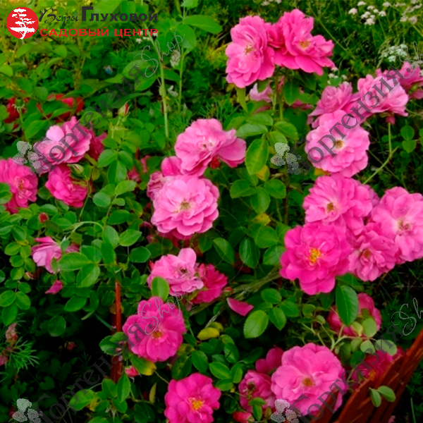 Роза Ругоза (Rosa rugosa) канадская 'Frontenac' - густой,ветвистый куст высотой до 120 см. Цветки малиновые. Когда цветки полностью раскроются, в центре появляется белое пятно, с белыми потеками, заходящими на лепестки, и темными тычинками в центре. Они полумахровые, но слегка чашевидные, и очень красивые, если смотреть на отдельный цветок. Однако, больше всего роза ценится за эффект в массе, когда куст покрыт цветками во время первого цветения. Они появляются в кистях по 3-5 шт, практически без перерыва до самых морозов. Листва темная, блестящая, устойчива к заболеваниям.