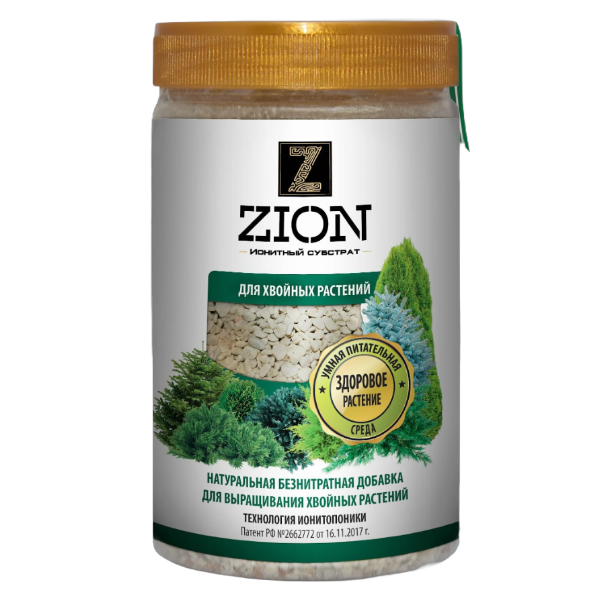 Удобрение Цион Для хвойных растений- питательный ионный субстрат, выделяет питательные элементы по запросу растения, обеспечивая  полноценное развитие растений:  густота кроны, насыщенность цвета хвои, рост. Применяется для посадки и подкормки всех видов хвойных растений. Предотвращает вымывание минеральных веществ, внесенных в почву. Позволяет на длительный период обходиться без внесения минеральных удобрений. ЦИОН содержит полный набор микро и макроэлементов, необходимых для гармоничного роста растений. Рекомендуется прямой контакт с корневой системой. Передозировка и корневой ожог невозможны. Не является минеральным удобрением, не содержит нитратов, гормонов, пестицидов, гербицидов и ускорителей роста. Обеспечивает формирование сильной корневой системы, эффективную подготовку растения к зимнему периоду и полноценное развитие растения после него.