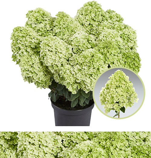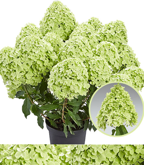 Метельчатая гортензия "Панорама" – эксклюзивная серия Патио немецкой селекции PAN, отличается невысокой, компактной формой куста, высотой до 100 см, рано зацветает и обильно цветет, неприхотлив в уходе. Соцветия плотные, конусовидные, в начале цветения нежно-зелёного цвета, затем белые, к осени приобретают лаймовый оттенок. На солнечном участке или в легкой полутени цветение будет пышнее и ярче. Ветви крепкие, прямостоячие. Цветет с июня по сентябрь. Почва кислая, влажная, но без застоя воды. Зимостоек, неприхотлив. Прекрасно смотрится как бордюрное растение, так можно выращивать и в кашпо.